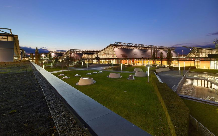 Weithin sichtbar markieren geschwungene, begrünte Dächer das Areal der Neuen Messe Stuttgart. Sie öffnen sich für den Einfall von Tageslicht und tragen zugleich Fotovoltaikanlagen zur Energiegewinnung. Leicht und großzügig wirkt das Ensemble sowie die einzelnen Messehallen.